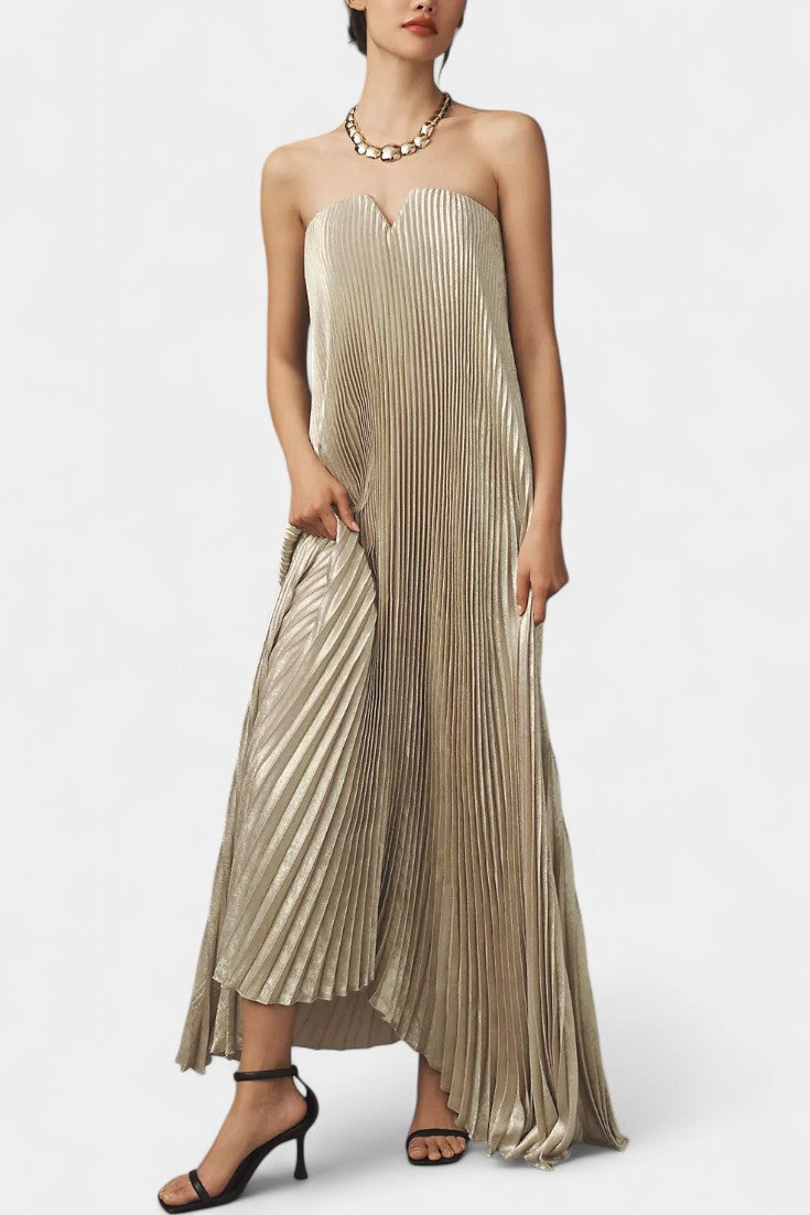 Diseñado para destacar con gracia y estructura. El vestido Andreia mezcla líneas definidas y movimiento fluido en una silueta A que favorece con naturalidad. El escote corazón con muescas añade un aire escultórico, mientras que los pliegues de cuchillo aportan dinamismo y elegancia en cada paso.